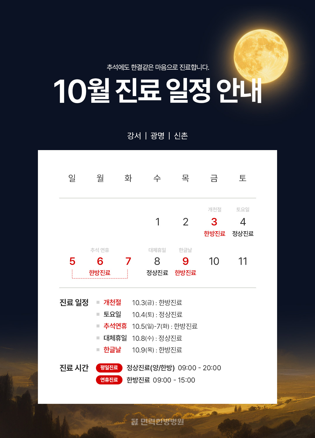 언제나 환자 여러분의 건강한 회복을 응원하며, 10월 추석 연휴 진료 일정을 아래와 같이 안내드리오니 내원 및 진료 예약 시 참고 부탁드립니다.